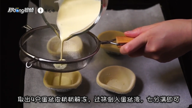 [图]4/5取出四个蛋挞皮稍稍解冻,过筛倒入蛋挞液,七分满即可。