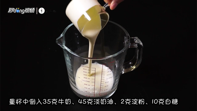 1/5分步阅读量杯中倒入35g牛奶、45g淡奶油、2g淀粉、10g白糖,将其搅拌至完全融合。