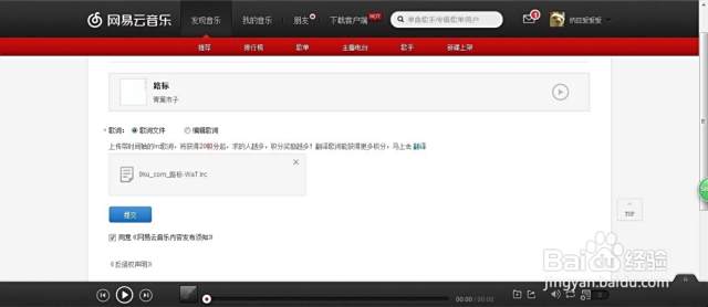 紧接着就会出现一个页面,有选择文件或者编辑歌词两个选项,我们可以根据自己收藏歌词的方式选择,如果有上传文件就点击上传文件,将文件上传即可。如果是编辑的或者是复制的就选择编辑歌词,将编辑的或者复制的歌词粘贴在下方空白的文字框里,选择上交,上传歌词就成功了,就可以等待系统审核啦。