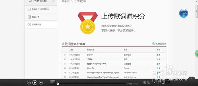 然后就会看到页面的右下方有很多赚积分的方法,比如签到,上传歌词等等,点击上传歌词选项