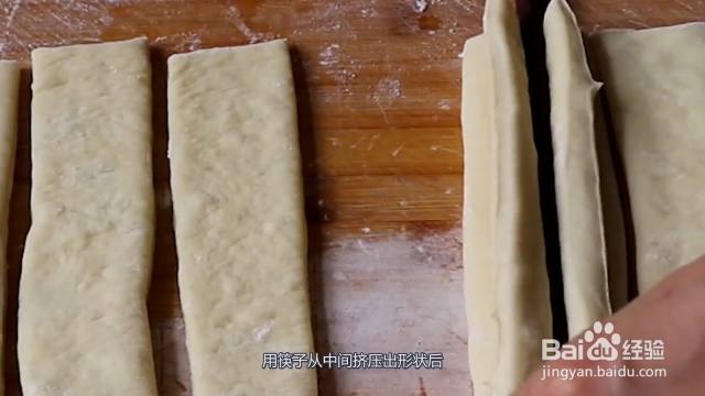 在长条上刷上清水,将另一长条压上去,用筷子从中间挤压出形状后,再拉长一些。