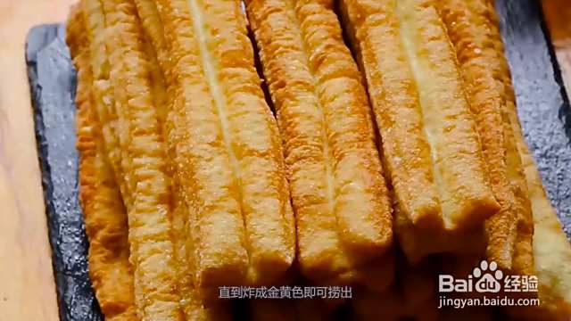 将长条下入六成热的油锅,不停的翻动它,直到炸成金黄色即可捞出。