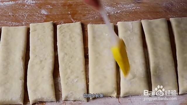 在案板撒上面粉,将面团拉长后,擀平,切成小长条。