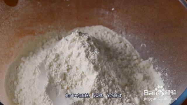 将500克面粉、5克盐、5克酵母、2克小苏打、一个鸡蛋、15克食用油、260克清水混合搅拌均匀。