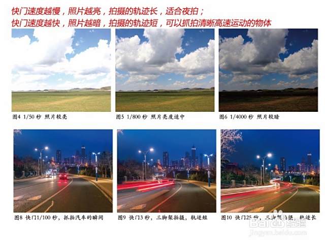 快门速度越慢,照片越亮,拍摄的轨迹长,适合夜拍;快门速度越快,照片越暗,拍摄的轨迹短,可以抓拍清晰高速运动的物体