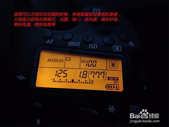 肩屏可以方面你在拍摄的时候,快速查看和设置相机参数,分别显示的有对焦模式、光圈、快门、感光度、曝光补偿、剩余电量、剩余张数等