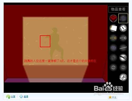 如果你现在点击发现就会跳出跳舞,一定要在这个人跳舞完,然后在那个位置用鼠标点击3次(因为人停顿了3次)。之后那个红色的墙就会出现变化,出现了一个保险柜: