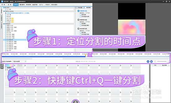 方法二:点击右侧视频预览区下方向下凸起的箭头,调出“创新式时间轴”(快捷键:Ctrl+E),鼠标在时间轴上定位到想要分割的时间点,然后点击界面上的“剪刀手”图标(快捷键:Ctrl+Q),即可一键快速分割电视剧片段。