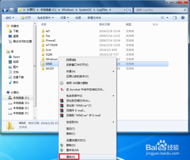 在LOgFiles文件夹下找到WMI文件夹,然后选中点击右键--属性,如下图所示i!其实就是让它获得永久管理员权限!我的方法可以不用每次重启电脑后都要修改一次权限!