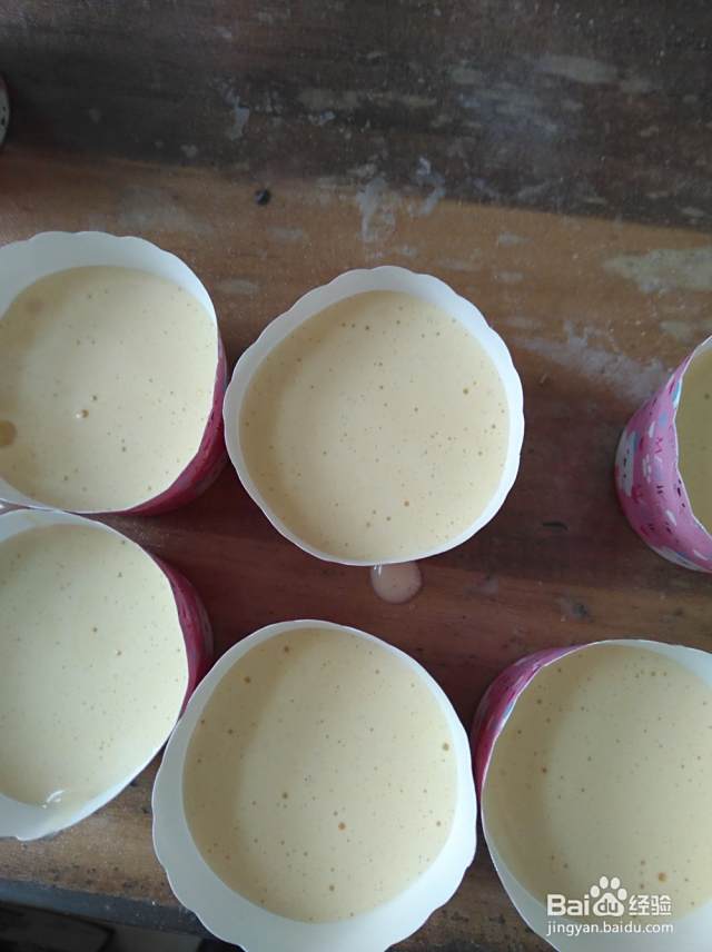 [图]5/6把面糊倒进纸杯里,不要倒满,八分就可以的。倒好之后,每个纸杯里再加入两三个葡萄干,一两个核桃仁