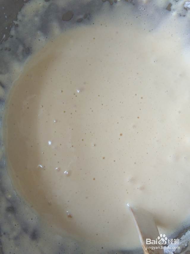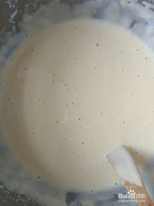 [图]3/6玉米油三十毫升,倒入一个干净的碗里,再倒入五十毫升的牛奶,我用的是旺仔,纯牛奶都可以的,用打蛋器把油和牛奶打到完全融为一体。倒入刚才的面糊里,轻轻的上下搅拌均匀