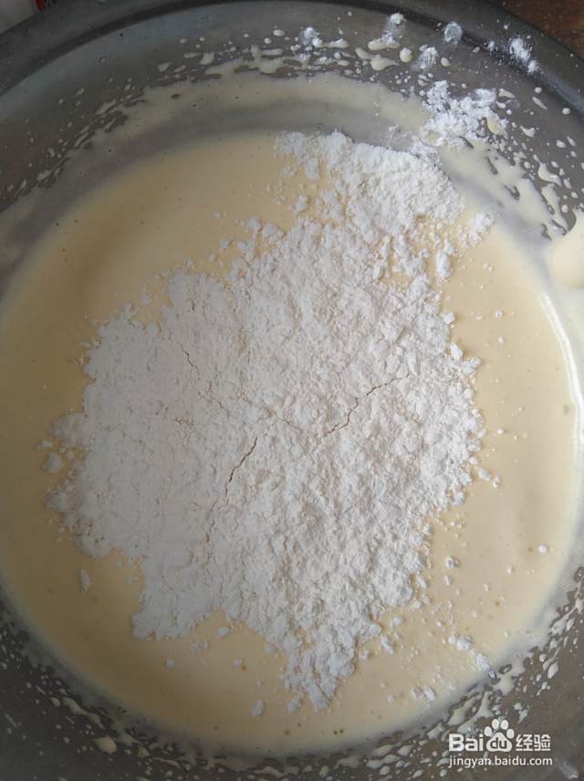 [图]2/6蛋糕粉取出一百克,普通面粉也可以,只要没有面疙瘩就可以的。分两次加入鸡蛋糊里面,上下搅拌均匀,不要有面疙瘩出现,也不要有干面粉,要和鸡蛋糊完全混合