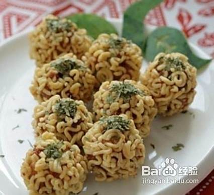 原料:方便面一袋、虾仁50克、猪肉馅100克、荸荠6个、葱末2大勺调料:淀粉一大勺、香油一小勺、方便面里的酱料包和调味包(喜欢什么味道的方便面就可以用哪种口味的,想要鲜一点的可以用海鲜味道的。想要味道浓郁一点的可以选用红烧牛肉口味的)点缀:泡面丸子上放的绿色香料是干香芹叶。盘子里摆盘用的叶子是西瓜皮做法:1.刚买的肉馅什么都不放先用筷子搅拌一下,让松散的肉馅变得紧致。而且要记得不要把所有的原料都放入后再搅拌,要每放一样食材就搅拌均匀后再放下一种食材。先放入两大勺葱末,之后搅拌,让葱末肉馅融合2.将荸荠洗干净后削皮切成细小的碎丁,放入肉馅中搅拌均匀。3.将新鲜的虾仁去皮挑去虾线后用刀背剁馅,用刀背这样剁的虾茸会更有弹性。将处理好的虾茸放入肉馅中搅拌均匀。4.把方便面包里的酱料包和调味粉包放到肉馅中。注意用量不用都放入,不然会很咸。5.在馅料里放入淀粉一大勺、香油一小勺来调味。6.顺着一个方向搅拌肉馅,让肉馅上劲。7.把泡面压碎,用肉丸子在泡面渣里滚一圈沾满方便面渣