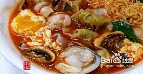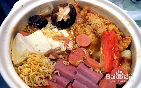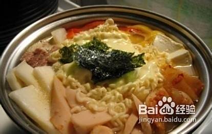用料:洋葱 半 个、 彩椒(黄、红)各 半个、半 块 豆腐、 适量 泡菜 、1 根 火腿肠、 6 片 年糕片、3 片 罐头午餐肉 、1 包 方便面 、1 片 芝士片、 2-3 片 海苔片 、适量 高汤(鸡、牛等汤)或水适量做法:1、洋葱、火腿肠、午餐肉、豆腐切片,彩椒切条,将以上材料连同年糕片、泡菜全部放进锅中,加入高汤(或水)炖煮。2、汤滚后,放上芝士片、海苔片,3、芝士融化后,就可以从拉面开吃了。。。