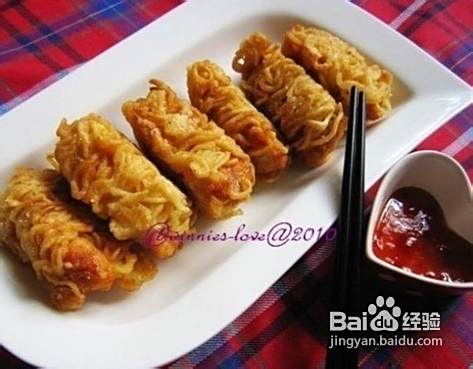 用料:方便面、鸡柳4条配料:新奥尔良粉,喼汁,鸡粉,生粉,生抽,蜜糖,香油做法:1、鸡柳洗干净沥干水份用叉子扎松组织,用新奥尔良粉,喼汁,鸡粉,生粉,生抽,蜜糖,香油充分按摩后腌至少三个小时以上。我是隔夜处理好备用滴2、腌得差不多了,就可先来处理方便面了。对于这个菜我一般会选用面质较爽较韧滴来做。不然一会缠绕时怕不好处理会断啊。于是我选用了四洲这个面质。最爽最不沾最好操作。大家看自己需要选择吧。3、锅中烧沸水,沸了投入面饼,煮到七成熟即可离火,捞起沥干水份放少许鸡粉和香油拌匀备用。4、腌好滴鸡柳一分为二备用,然后拿起一块鸡柳用处理好滴方便面卷起来,扎紧不会松散开来就可以了,这时候准备生粉少许和一个蛋打散备用,先把扎好滴方便面鸡柳放到全蛋液中洗个小澡哈。再往生粉(即粟粉也)处转一圈。完成了它升级任务啊。5、平底锅中热油锅,油相对要多些。若你想松脆就直接沾面包糠开炸吧。更爽吃起来。我们为了能吃到更嫩滑滴新奥尔良鸡柳就用了煎滴方式。更适合我滴口味。大家视乎自己口味来选择了,煎至二面金黄即可,配个泰式酸辣酱,美呆了。。。