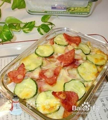 原料:方便面一包调料:黄瓜半根,火腿半根,自制披萨酱三大勺,马苏里拉芝士40克,洋葱、橄榄油各少许做法:1、锅内水烧开,放入方便面饼;2、将方便面煮至五成熟即可;3、捞出煮好的方便面放入少许橄榄油搅拌均匀;4、放入自制披萨酱抹平后放大约20克芝士;6、放入洋葱丁和火腿、黄瓜片,再撒上剩下的芝士即可;8、烤箱200度上下预热后,烤20分钟即可。小贴士:1、没有自制披萨的可以放意面酱或番茄酱,也可以放入别的蔬菜,我这是正好家里有这些菜就做了,并没有特意去买。2、自家烤箱温度要自行掌握,可不要烤糊了。