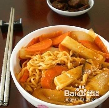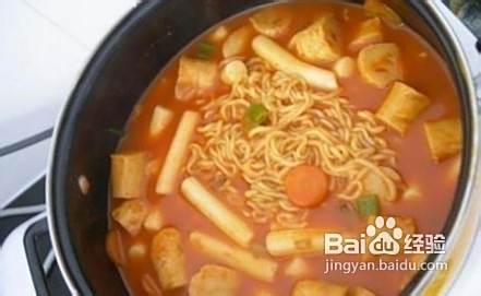 用料:辛拉面、年糕、胡萝卜、洋葱、香菇、辣酱做法:1、锅内烧开水后放入两勺辣酱,依此放入年糕、胡萝卜、香菇,中火煮三分钟左右2、然后放入辛拉面和洋葱,这时可以品尝一下,如果淡一点,可放入辛拉面里的料包3、待所有食材煮好后,汤汁也收得差不多时即可。