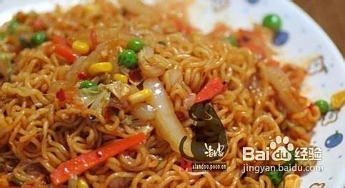 用料:方便面、白菜、玉米粒、青豆、胡萝卜、葱、辣椒酱做法:1、煮面,水浸2、爆锅,炒菜3、加面,拌匀4、最后加了N多辣椒酱5、火红的一片辣的很爽