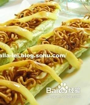 用料:方便面一袋(可根据个人喜好选择各种口味方便面 ),卤鸡蛋 ,洋葱, 牛肉 ,番茄 ,葱做法:1、把所有配料放在一起煮好后捞出待用2、选择CHEESE是一定要注意 最好是 CHEDDAR CHEESE 因为这是能与面融合的最好的CHEESE了如果是在没有的话 MOZZARELA CHEESE 也可以但是口感就没有那么好了 主要是M cheese 太黏了 吃完后会导致满嘴都是cheese。3、满满的盖上CHEESE4、放入微波炉中 一分钟 等到CHEESE刚刚融化就可以了5、融化后 现在可以开动了 小心烫哦!值得一提的是 方便面在微波炉里走一遭之后 变得更好吃了 当cheese和面完全融合在一起的时候 放入嘴里简直就分不清到底吃的是cheese还是面了 cheese已经整个将面裹住了 两种丝滑的感觉在嘴里交汇 OH MY GOSH!天堂啊!