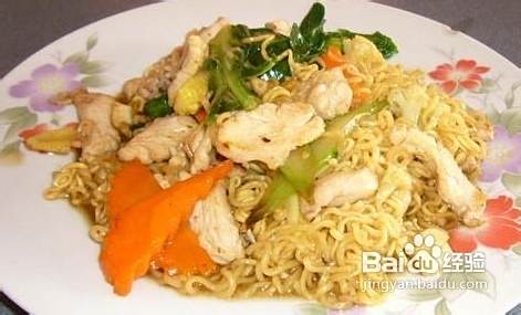 用料: 方便面 胡萝卜 青菜 芹菜 鸡肉或猪肉 玉米宝宝做法:1.方便面水泡开,不用煮2.用油把蔬菜鸡肉猪肉炒熟3.把泡开的面放进去+盐+糖+鸡精炒一下4.就可以出锅了小贴士:1.方便面要精道(好劲道千万不要买,太差)2.方便面开水泡1-2分钟就可以了3.细的比粗的炒出来好吃4.不要放酱油,颜色很好看