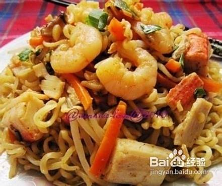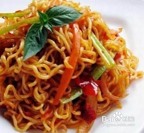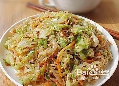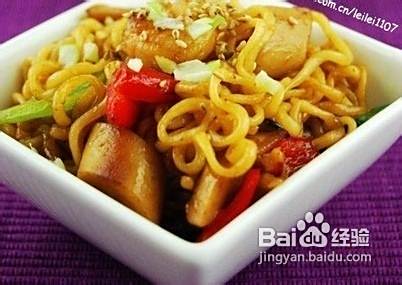 原 料: 方便面2包、包菜250克、鸡蛋2个或猪肉100克、白酒、白糖、姜丝少许、葱花、盐、酱油,味精各适量。做 法:1.锅中放适量清水烧开,把方便面放入锅中煮至散开,立刻捞出(不宜煮太软),散放到篦子上控水,备用。2.炒锅放火上,倒入适量花生油,待油热,放入葱花、姜丝煸炒,将猪肉放入锅中(如果炒鸡蛋就就把鸡蛋搅匀后放入油中,不加白酒、白糖)翻炒,加入2滴白酒,少许白糖、酱油,待肉炒八成熟,放入包菜翻炒。3.将控好的方便面放入锅中,加盐、味精,翻炒2分钟,只要把菜和方便面拌匀即可。40/43美味炒方便面