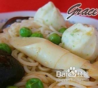 用料:冬阴功方便面一包,笋、香菇、青豆、鱼蛋做法:冬阴功方便面一包,与自己喜欢的蔬菜同煮,我放的是笋、香菇、青豆和鱼蛋,这种鱼蛋是夹心的,里面好像有鱼籽,咬起来咯吱咯吱的很好玩,又好像还有蟹黄的味道,搞不清楚究竟是什么东东,鱼蛋很弹牙很好吃~