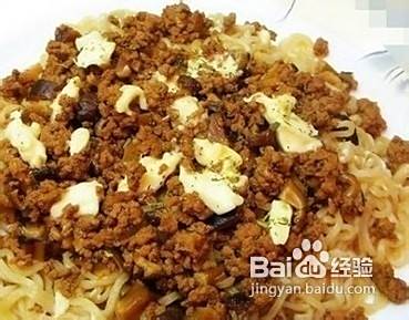 用料:肉末、水发香菇7粒、姜蒜、方便面饼、Tabasco辣椒汁、Cheese做法:1)香菇洗净切丁,留泡发香菇的水,姜蒜切片待用;2)方便面清水煮熟,捞起滤水拌少许油防止粘粘;3)肉末用热油煸白,放入姜蒜片煸香后与肉末香菇丁一同翻炒,加入老抽、生抽、料酒及鸡精,加入泡发香菇的水,再加一碗清水煮开后,小火焖15分钟左右,调适量盐即可装碗;4)用勺子把肉酱及汤汁淋在面上,这已经是中式的肉酱拌面了;5)想西式的,在面上撒上Cheese(我这个是小块状的,很不方便,有片状的最好,马苏里拉就不用了,太奢侈了吧)及香草碎,进烤箱或微波炉用光波,将Cheese烤化了即可。炉门一开,香气四溢,你还在等什么呢?若觉得又是肉又是Cheese很腻,浇上Tabasco的辣椒汁,酸酸辣辣,更是别番滋味还有一种方法也很棒:用料:鲜辣椒5根切大段或者不切、蘑菇切丁少许、大头菜少许、四川麻辣味道的方便面做法:1)把鲜辣椒放在锅里不放油煸炒,待其发蔫,倒入开水煮一下,放蘑菇。2)煮面。3)撒上榨菜丁。