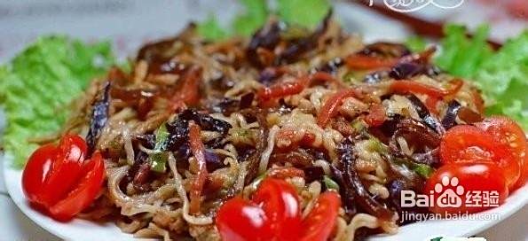 用料:方便面2包,姜丝、黄瓜丝(用盐淹一下)、胡萝卜丝、小虾米、葱花做法:1、水发香菇切丝、水发木耳切丝、鸡蛋摊成蛋皮切丝2、方便面2包,水开后下锅煮至七分熟,放入纯净水内捞一下,摊开放置待用。3、铁锅放油(多一点)烧热,放盐,依次放姜丝、小虾米、香菇木耳(每放一样,翻抄几下再放另一样)抄出香味后放入胡萝卜丝、黄瓜丝翻抄后放入方便面、蛋皮翻抄,起锅前放盐、葱花、味精装盘即可。30/43改头换“面”
