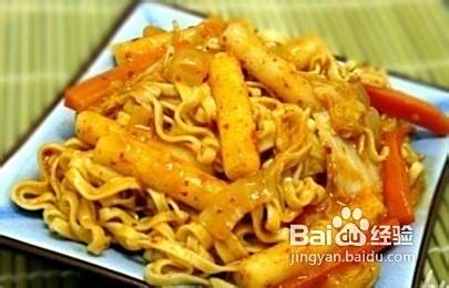 材料:泡麵1/2包、條狀年糕20小條、魚餅 (又稱甜不辣)、1/2 片 (切 約3公分塊狀)、高麗菜 (又稱圓白菜) 少許、洋蔥1/8個 (切絲)、紅蘿蔔約5~6片 (切片)、韓國辣椒醬1又1/2大匙、白糖1/2大匙 (量可依個人喜好,韓國口味是甜甜的,我也覺得甜一點比較好吃)、水300~400ml (煮的過程中可依情形決定水的用量)※可依情況加適量鹽調味做法:1.將300ml 的水、條狀年糕、韓國辣椒醬、白糖,放入鍋中煮煮滾轉小火邊煮邊翻炒(翻炒是要防粘鍋底) 一直到年糕變軟煮的過程.....水會慢慢變稠變少,可以酌情的再加水進去2.年糕煮軟後 .....就可以加入魚餅、高麗菜、紅蘿蔔,繼續小火邊煮邊翻炒3.煮年糕的同時....再煮另一鍋水,等年糕快好的時候,放入泡麵煮至7分熟4.將泡麵撈起,放入辣炒年糕中拌勻,即完成也可以在起鍋前灑些大蔥白,翻炒均勻,味道會更好喔.....貼心建議:◎年糕容易沾黏鍋底,因此在烹制過成中要不時的翻炒這也是為什麼要稱為炒年糕的典故◎煮年糕時...建議醬汁多一些,因為之後加入泡麵,很容易就給麵吸收光了◎也可以用寧波年糕片替代...