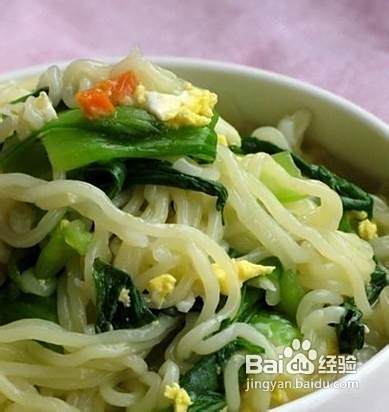 用料:方便面1包,鸡蛋1个,青菜适量做法:1.将水烧开,加入方便面2 煮开后加鸡蛋和青菜3 3分钟后放盐和鸡精就OK了。~~