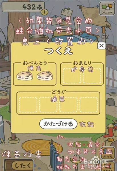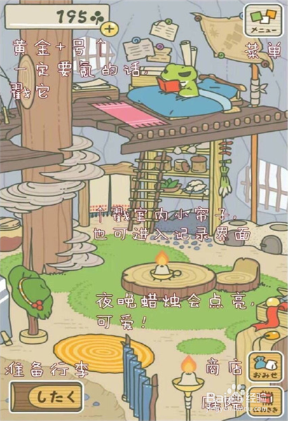 [图]5/20我们进入房间内之后,里面的显示是这样的。右下角的进房间就会变成点击进入庭院,而左下角就是让我们的青蛙开启旅行前的准备行李哦。