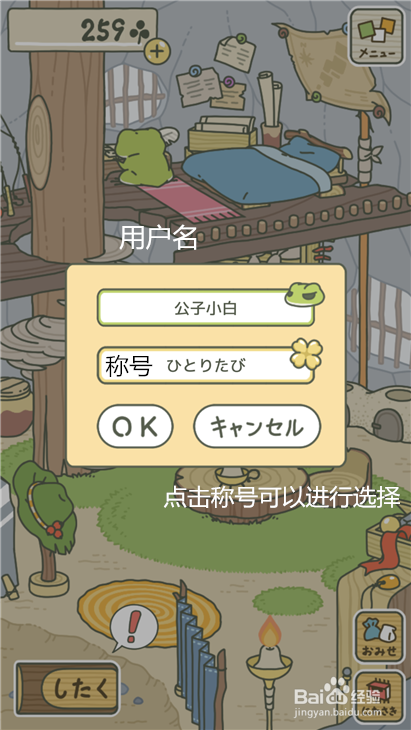 [图]8/20如果青蛙在家,我们点击青蛙,会弹出这样的内容,上面是你的用户名字,而下方显示的是你的青蛙称号,我们现在看到的就是青蛙第一次旅行带回来的称号,这个是自动出现的,而点击后你可以选择其他的,前提是你获得了,获得的方法就是青蛙旅行后带回来的。