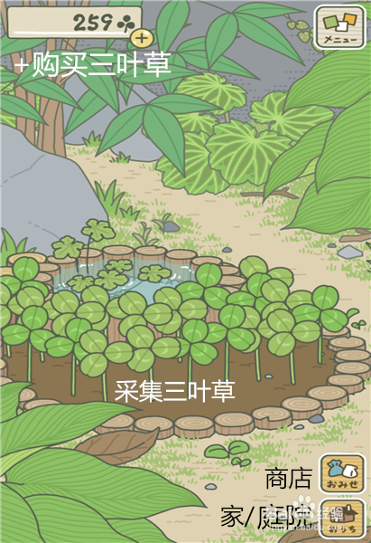 1/20分步阅读我们进入游戏后的第一件事,务必是在庭院里将我们池塘边的三叶草全部采摘干净,这个就是我们的货币,用来买各种道具的,所以这是第一件要做的事情。而这里是我们的庭院,在界面里有4个按钮,左上角是三叶草的数量,想要购买可以点击加号,右上角是菜单,左下角分别是商店和家,如果是在家中,底下的意思就是回到庭院。