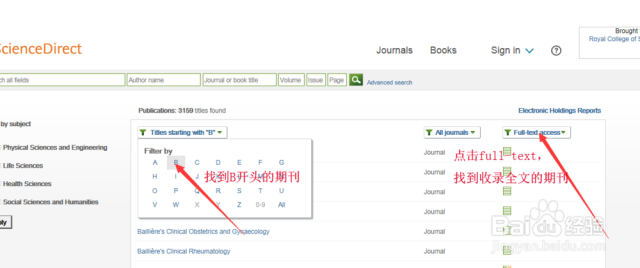 2/6先点击右边的full-text 全文按钮筛选下有全文的期刊,再点击左边的Titles starting with 按钮 选择期刊首字母B,这样可以快速查到B开头的期刊,BioorganicandMedicinalChemistry见下图:
