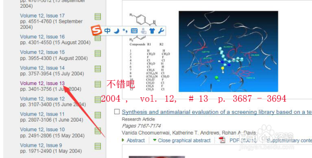 点击期刊名字进入页面会看到期刊详细的 期刊年限,卷码,页码 列表 找到你需要的2004,vol.12,#13p.3687-3694