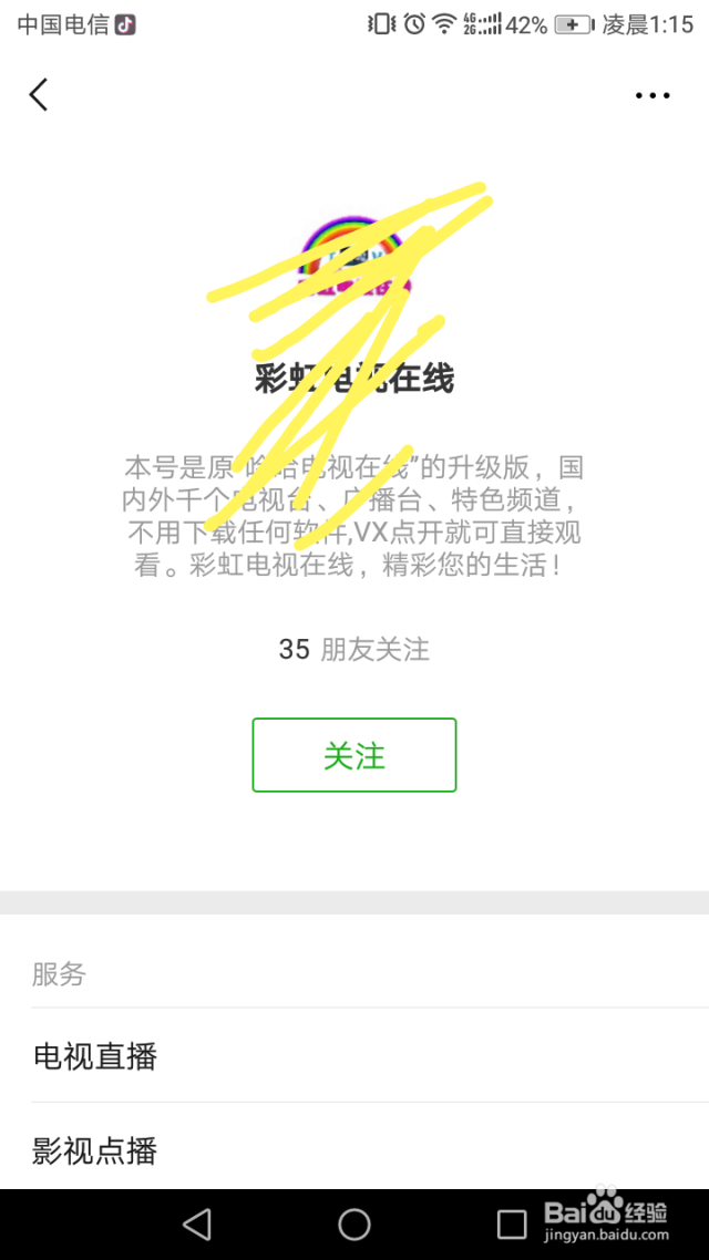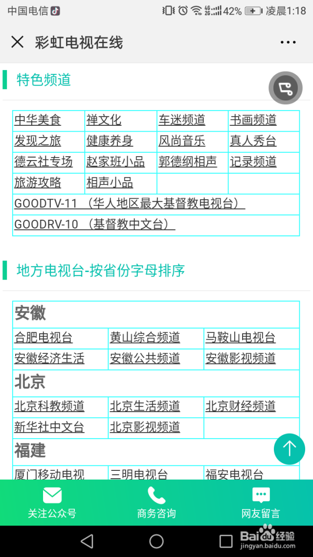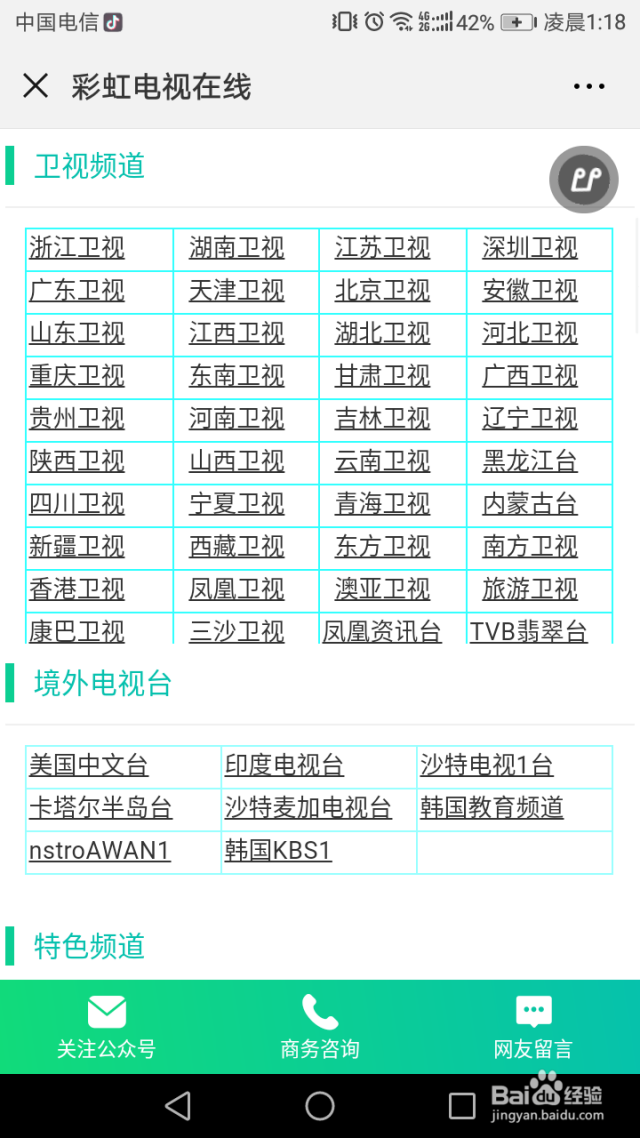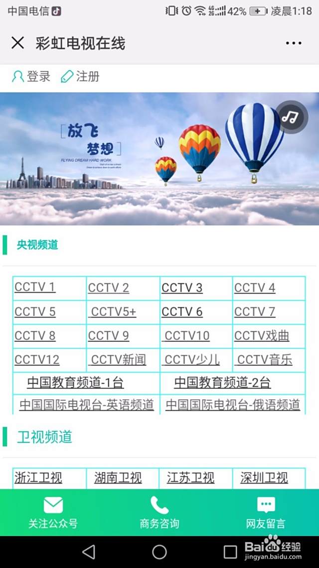关注后进入公众号主页面,点击底部第一个菜单“电视直播”