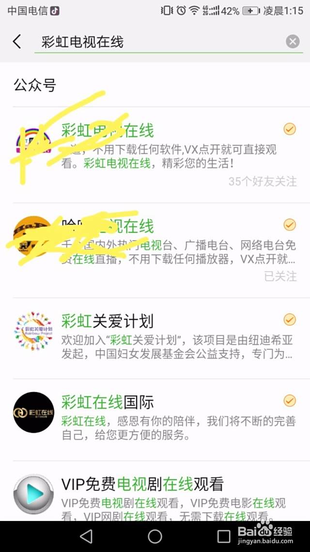 在顶部搜索栏输入公众平台微信号或公众号名称彩虹电视在线,点击搜索标志后下方显示出目标公众号,点击它