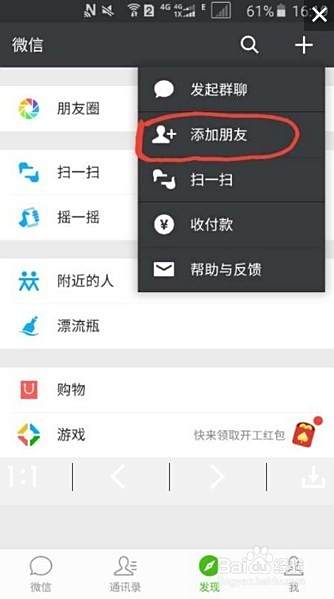 1/6分步阅读点击手机微信右上角的“+”,在下拉列表中点击“添加朋友”