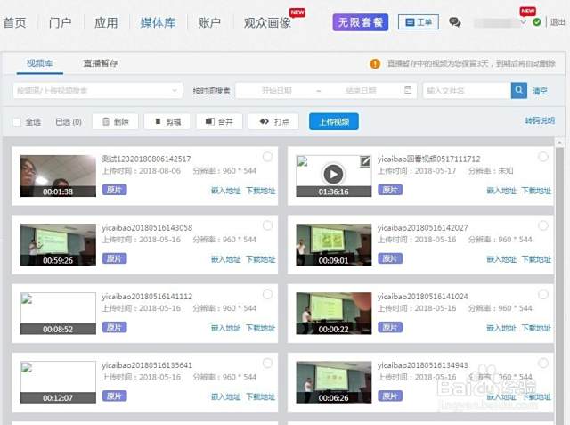 媒体库对应的是每一段直播开始推流到结束推流的视频存放区,可以对视频进行合并、剪辑、删除、打点等各种设置