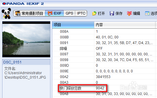 选择相机中最后拍摄的一张照片上传,此时在照片的EXIF信息摘要中就可以看到快门次数。