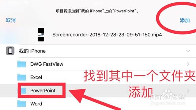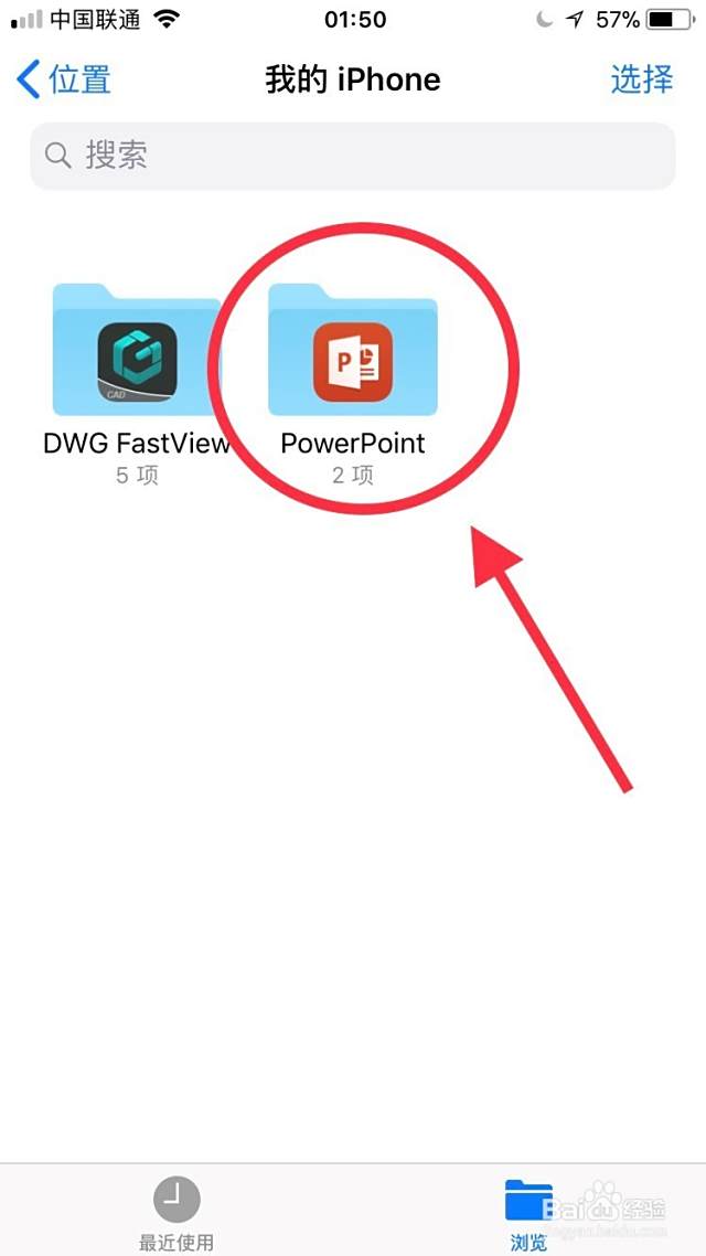 方法1:打开文件APP后如图8所示,浏览选项中点我的iphone,再点击我们刚刚保存过的文件夹PowerpointPPT文件夹能找到我们刚保存的视频!