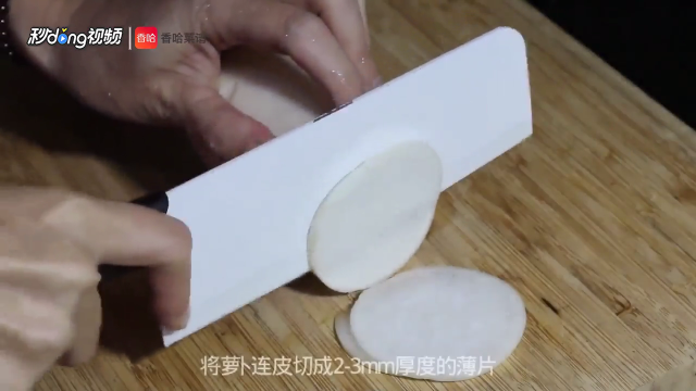 1/9分步阅读将萝卜切成2至3毫米的薄片。