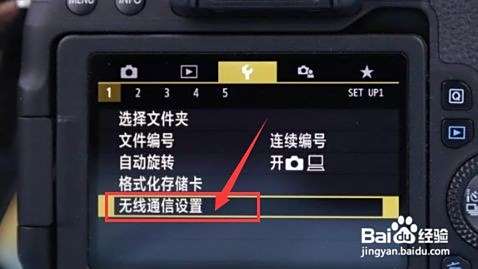 1/7分步阅读实现,在相机【设置】里找到并打开【无线通信设置】,如下图所示。