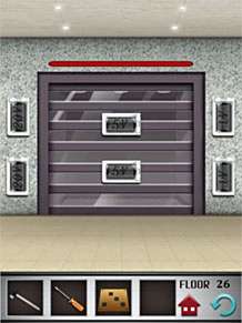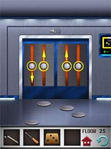 第二十五关(第25层):电梯门有些像播音的音频均衡器,四个滑杆可以上下滑动。地上的按钮是给玩家的一个提示,按照按钮的位置上下调整滑杆,然后即可打开电梯门。点击绿色箭头进入下一层