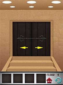 第二十二关(第22层):电梯门板可以向任意方向移动,但就是打不开,在门的右侧露出了一个字母,使用储物箱中的锤子将石狮敲碎,字母完全显示出来。N-E-W-S,代表North-East-West-South,按照提示将门依次向上,向右,向左,向下滑动,电梯门即可打开。点击绿色箭头进入下一层