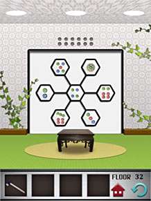 第六关(第6层):找到打开电梯门的机关,它藏在盆景的后面,移动盆景即可看到。点击机关使之启动,看到机关颜色变亮,然后依次点击电梯门上与机关形状相同的锯齿状按钮,这样就可以打开电梯门,然后点击绿色箭头进入下一层。点击绿色箭头进入下一层