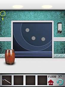 第三十七关(第37层):电梯门上有三盏灯,解开一个机关会亮起一盏灯,三盏灯全亮的话电梯门就自动打开了。点击左上角的可滑动木板打开暗格,点击拾取里面的小钢珠解开第一个机关。移开电梯门前的桶,解开第二个机关。将手机倒置,使右侧的小钢珠离开按钮解开第三个机关。点击绿色箭头进入下一层