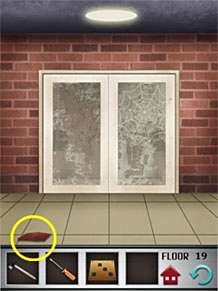 第二十关(第20层):首先拾取地上的螺丝钉,然后将警告牌挪开。这时候可以发现电梯门右下方缺少螺丝钉,将螺丝钉放进去。点击使用储物箱中的螺丝刀,将螺丝钉拧紧,电梯门就打开了。点击绿色箭头进入下一层