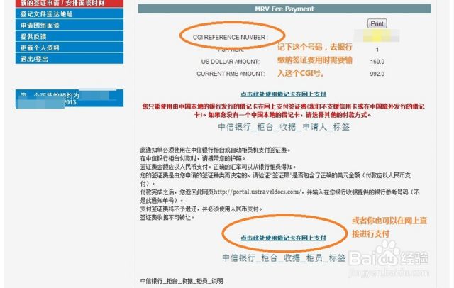 然后就是缴费和约面谈的时间了。回到步骤2中签证申请主页面,在“如何申请”标题下找到“第4步”,点击“登录”链接后会先让你进行个人注册,注册后才能登录。登录后,请完善你的个人信息,注意这个档案里填的信息需要与你之前DS-160填的东西一致,填完之后会有缴费的那步,并获得一个缴费码,叫做CGI reference number。请记录下这个号码,然后凭借这个号码去中信银行缴纳签证费(美国签证与中信银行之间有合作),都不用去柜台,直接在ATM机器上缴费就好(操作可以询问银行工作人员),缴完后务必记得打印回单。 当然,你也选择直接在网上用银行卡支付。