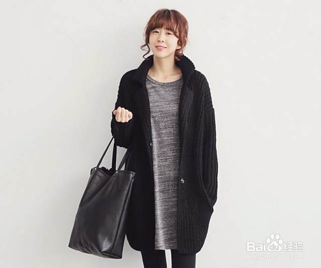 这一套搭配是比较有韩范的,灰色长款T恤简约大方又宽松休闲,搭配一条黑色打底裤显瘦又时尚,再配上这件黑色中长款外套,帅气又不失女人味。